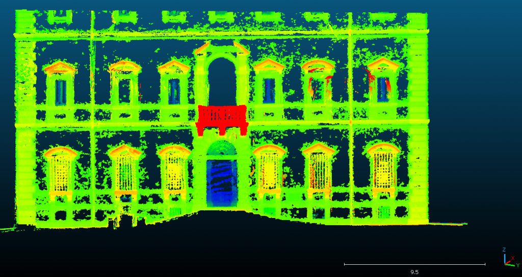 Nell’immagine è rappresentata la differenza di planarità rilevata su una parete verticale, ottenuta attraverso l’elaborazione di una nuvola di punti generata da immagini acquisite tramite drone.